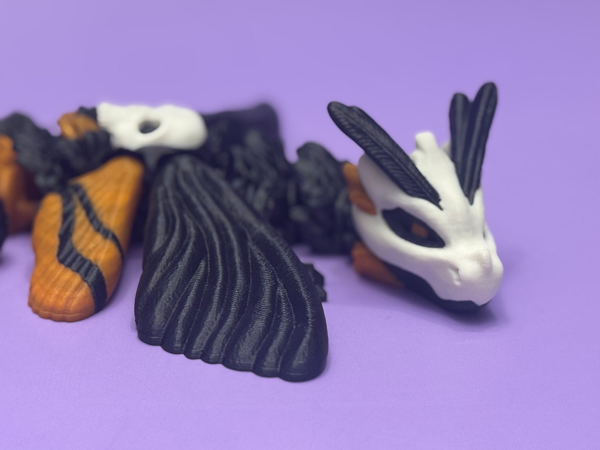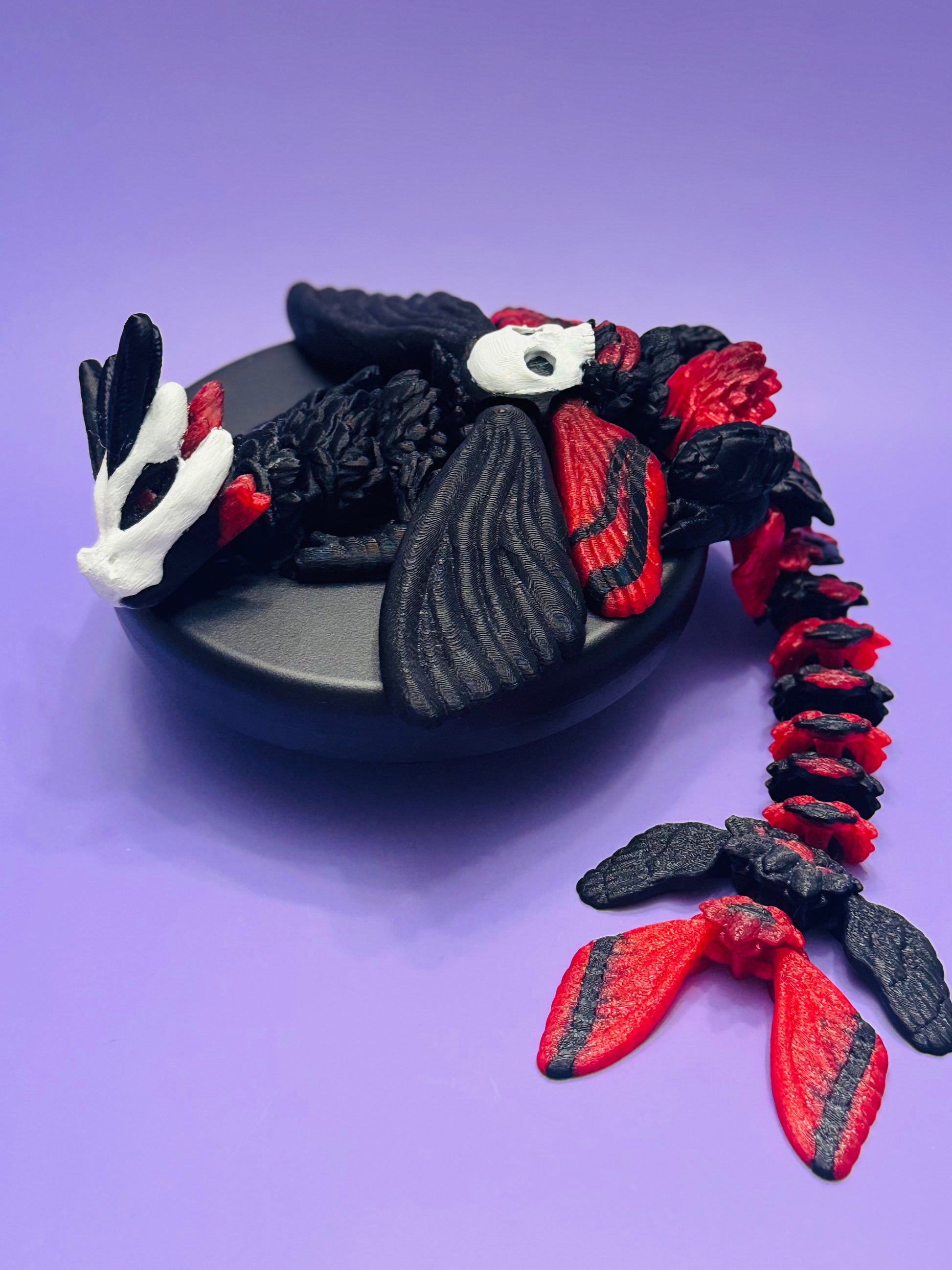 Dark, elegant, and a little mysterious this 3D-printed Shadow Dragon brings gothic fantasy to life. Designed with smooth articulation, it bends and curls naturally, making it both a striking display piece and a satisfying fidget toy. The black-and-red body is accented with bold wings, skeletal mask details, and a flowing segmented tail that ends in dramatic fins.